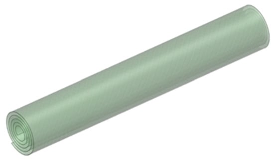 A full-size spiral wound RO membrane module (Dupont Filmtec-BW30-400) consisting of 10 membrane sheets that were 2.05 m long and 0.9 m wide (with an effective membrane area of 400 ft2) and wounded along an Archimedes spiral [27] was modelled in this work. Adjacent membrane sheets shared a common feed channel and ran parallel with one another with some independency; hence, the module’s geometries could be simplified to possess only a single feed channel for the simulation (Figure 3). The geometry of a single feed channel was created using ANSYS SpaceClaim (2019R3) (Ansys, Inc., Canonsburg, PA, USA). Looking down from the axial direction, the Archimedean spiral for the single feed channel rolled up along the length of the membranes had the following equations: