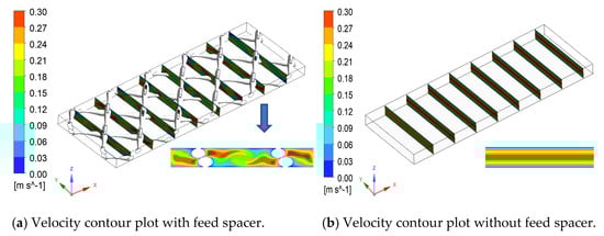 A wave-like flow pattern was observed in the flow field due to the presence of the spacer filaments (Figure 4a). Strong vortices appeared between the spacer filament and the membrane surface, which enhanced the flow velocities on the membrane surface (in the Y direction). These vortices disappeared in the absence of the spacer and led to turbulent flow in the middle of the channel (in bulk solution) while stagnant flow in the boundary layer where mass transfer relies on diffusion (Figure 4b). The presence of the counter-flow vortices inside the spacer-filled channel reduced the boundary layer thickness and consequently increased the average mass transfer coefficient to 1.59 × 10−4 compared to 7.95 × 10−5 in the absence of the spacer and reduced the CP. The mass transfer coefficient on the membrane surface can be calculated by the following: