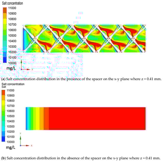 Salt concentration distribution on the x-y plane where z = 0.41 mm in the presence and absence of the feed spacer: (a) with the spacer; (b) without the spacer.
