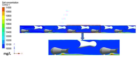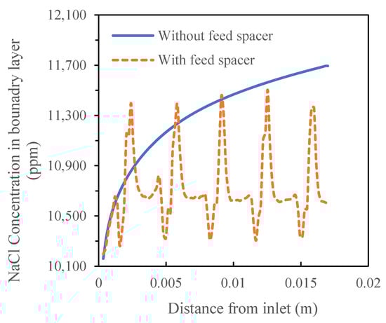 A quantitative analysis showed that the presence of the feed spacer led to a periodic fluctuation of salt concentration in the boundary layer between 10,196 mg/L and 11,504 mg/L while the salt concentration in the feed channel without a spacer increased along the flow direction from 10,195 mg/L to 11,694 mg/L (Figure 7).