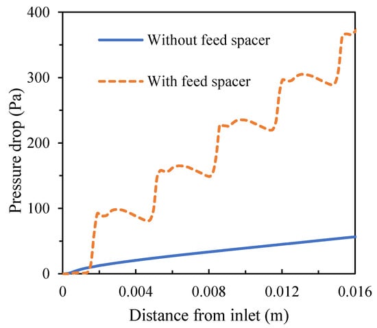 Pressure loss along the crossflow flat sheet module in the absence and presence of the feed spacer.
