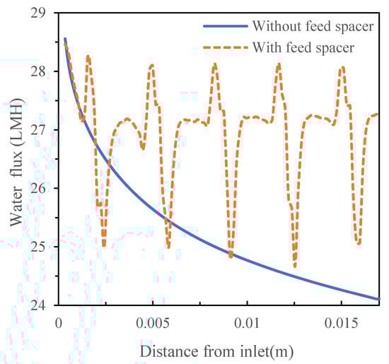 Flux distributions of the spiral wound RO module along the feed direction in the absence and presence of the feed spacer.