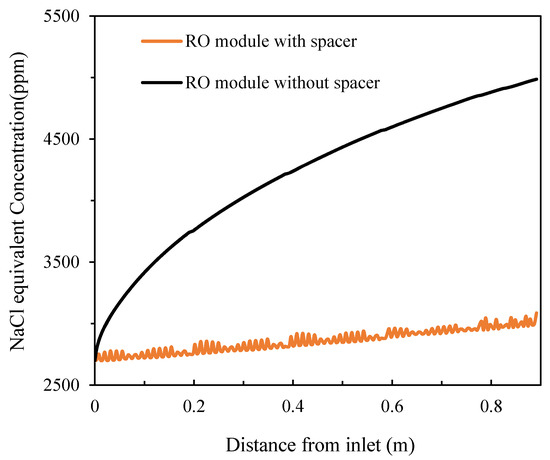 Salt concentration distribution of the spiral wound RO module along the feed direction in the absence and presence of the feed spacer.