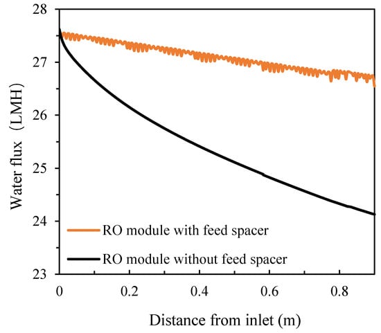 Simulations were conducted on the full-size RO module (Dupont Filmtec-BW30-400) with a feed pressure of 1.09 MPa. The simulation results on 10,000 mg/L of feed concentration showed that permeate flux reduced linearly along the feed direction in the absence of the feed spacer (from 27.6 LMH near the inlet to 24.1 LMH near the outlet) (Figure 10). The flow velocity had a minimal component that was perpendicular to the feed direction and tangential to the Archimedes curve; it had a magnitude of less than 0.003 m/s, which was only 1.5% of the average axial flow velocity. Thus, the flow velocity’s impact on the flow field was limited and this is consistent with previous researchers’ conclusion that the curvature of the membrane surface has a negligible effect on the flow distribution within the feed spacer via the simulation of a single feed spacer module [29,30].