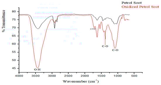 The successful oxidation of the soot particles was confirmed by the increased amount of oxygenated functional groups (including carboxylic and hydroxyl) observed from the FTIR spectra (Figure 2) [14,19]. Specifically, the appearance of bands at 1722 cm−1, 1545 cm−1, and 1384 cm−1 representing C=O, C–C, and C–O stretch vibrations, respectively, are indicative of carboxylic group. The band observed at 1384 cm−1 signifies the emergence of oxygenated moieties either from hydroxyl, carboxyl, or carbonyl as a result of the oxygenation [14], whilst the broad band at 3433 cm−1 is as a result of O–H stretch, further confirming the presence of carboxylic acid groups.