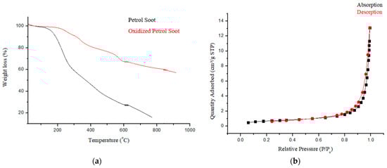 Thermogravimetric analysis (Figure 3a) exhibited three thermal events. The initial event between 50–150 °C is assigned to the dehydration of the samples [15]. The loss from 200–350 °C is assigned to the degradation of the carboxylic group, whilst the loss from 350–580 °C is assigned to the loss of the hydroxyl functional group [29]. These support the successful oxidation of soot since these were absent in the nascent soot particles.