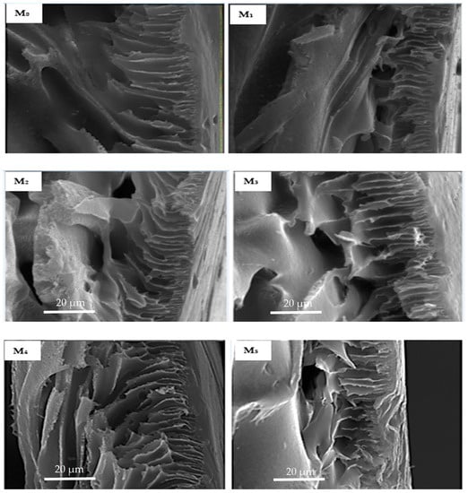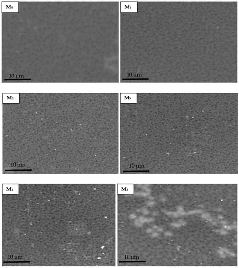 Micrographs of the cross-section (Figure 5) of fabricated membranes reveal a classic asymmetric arrangement consisting of a skin layer and a thick finger-like spongy sub-layer in all membranes. The addition of oxidized PSN to the dope solution remarkably resulted in an increased abundance of a finger-like microvoid sublayer in M1 (0.05 wt %) with respect to the base membrane (M0), signifying an increase in membrane porosity. On further increasing PSN loading in the dope solution (0.1–0.5 wt %), the finger-like microvoid sublayer enlarged across the membrane, signifying a further increase in porosity of the membrane relative to the base membrane. This is ascribed to the rise in the extent of substitution of solvent with water during the phase inversion process, a consequence of increased hydrophilicity of the dope solution by nanoparticles [24,32]. Nonetheless, excessive loading of PSN in M5 (1.0 wt %) decreased the abundance of the finger-like microvoid as heightened viscosity of dope solution started to dominate the demixing operation, suppressing the formation of the finger-like microvoid [24].