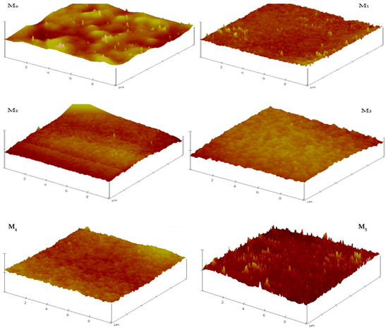 AFM was deployed in determining the roughness parameters of the fabricated membranes. The micrographs (Figure 6) reveal that the membrane surface became relatively smoother with the inclusion of PSN in the formulation. All composite membranes had lower roughness than the pristine membrane, with the lowest roughness observed for M1 (0.05 wt %), drastically reduced from 47.0 to 24.0 relative to the pristine membrane (M0). This decrease (M0 to M1) is ascribed to the good dissipation of PSN along with their migration towards the membrane surface in the course of phase inversion operation, leading to the formation of a more uniform and tighter surface with decreased surface roughness [22,33]. However, on further increasing the PSN concentration in the formulation, the surface roughness increased as a result of concomitant surface accumulation and aggregation of PSN particles [22,33]. Table 2 summarizes the roughness factors (Ra and Rq) obtained from analysis of AFM data. The data confirms that all composite membranes had lower roughness than pristine membranes which bodes well for potential fouling resistance of the composite membranes. Surface roughness is also significant in the fouling propensity of membranes [33]. The prevailing theory is that increasing surface roughness increases the contact area accessible for foulant interactions, resulting in considerable adhesion forces between the foulants and membrane [22,33,34,35].