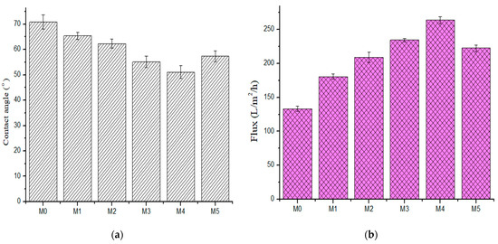 (a) Contact angle (b) pure water flux of fabricated membranes (M0) 0.0 wt %, (M1) 0.05 wt %, (M2) 0.1 wt %, (M3) 0.3 wt %, (M4) 0.5 wt %, and (M5) 1.0 wt %.