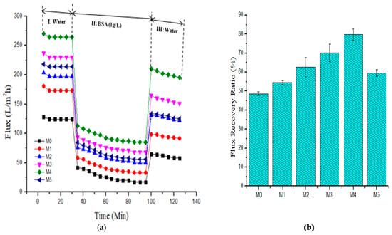 (a) Pure water flux and BSA (1 g·L−1) fouling pure water washing cycle and (b) resultant flux recovery ratio for fabricated membranes (M0) 0.0 wt %, (M1) 0.05 wt %, (M2) 0.1 wt %, (M3) 0.3 wt %, (M4) 0.5 wt %, and (M5) 1.0 wt %.