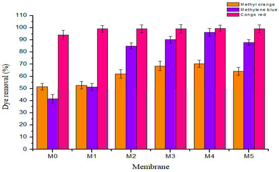 The dye exclusion capacity of fabricated membrane was determined using three model organic dye compounds, namely methyl orange (MO, MW ≈ 327 g·mol−1), methylene blue (MB, MW ≈ 320 g·mol−1), and Congo red (CR, ≈697 g·mol−1) at ambient temperature. The three model organic dyes were selected as target pollutants of industrial and environmental relevance, being potentially toxic, chemically resistant, and non-biodegradable [2,38,39]. All the three compounds are heterocyclic aromatics with MB being cationic, MO anionic, and CR a neutral dye. CR is the largest molecule whilst MO and MB have similar molecular weights. Figure 10 and Table 4 show the rejection profile and data obtained from all the membranes, respectively. Congo red was rejected by all membranes (˃95% rejection). MB was rejected highly by membranes with high PSN content (all above 80% with M3 and M4 at 90% and 96%, respectively), with M1 (42%) and M0 (48%) having similar rejection profile for this dye. MO was the least rejected dye at between 50 and 71% by all membranes, with M3 and M4 showing the highest rejections at 68% and 71%, respectively. It is worth nothing that M5 showed a decline in rejection relative to M4 in all cases, i.e., for CR it was 100% to 99%, for MB, 96% to 88% and MO, 71% to 64%. The high rejection of CR is a confirmation that the fabricated membranes are UF, as CR is being continually utilized in evaluating UF membranes’ molecular weight cut off [30]. On the other hand, the increasing rejection observed for MB with increasing PSN content indicates that there is specific interaction between the dye and the PSN fillers, probably due to some electrostatic interaction between oxygenated functional groups on PSN and the positive charges on the dye. Shenvi et al., [4] reported that electrostatic forces of attraction of a negatively charged membrane outer layer allying with positively charged MB dye molecule was responsible for the increased dye exclusion capacity exhibited. It is thought that similar behavior was operating here, resulting in high MB exclusion on high PSN loading. The narrow rejection band among all the membranes for MO indicates that the rejection mechanism for all of them is predominantly similar, probably size exclusion. This is supported by the overlap of the rejection band for MO, where rejection was lowest and dominated by size exclusion more than the electrostatic interaction alluded above.