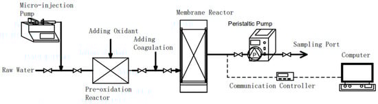 All of the experiments were conducted using a laboratory-scale membrane set-up, as shown in Figure 1. It consisted of the following three parts: a mixing and dosing system, a membrane filtration section and a data recording system.