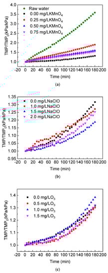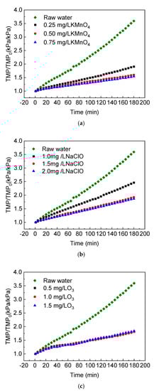 As shown in Figure 2b, the specific transmembrane pressure rate showed a decrease from 2.46 to 1.87 during the 180-min filtration, with an increasing NaClO dosage from 1.0 to 2.0 mg/L. Compared to raw water filtration, the relative proportion of fouling decreased from 68% to 52%. The degree of membrane fouling was negatively related to the oxidant concentration. The slope of the 1.5 and 2.0 mg/L NaClO curves were similar, which indicated that when the dosage was higher than 1.5 mg/L, increasing the concentration could no longer effectively reduce the degree of membrane fouling.