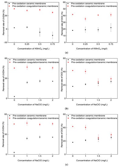 Effect of pre-oxidation on the removal rate of UV254 and DOC: (a) KMnO4; (b) NaClO; (c) O3.