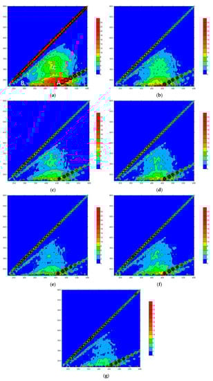 Fluorescence spectra of raw water and NaClO pre-oxidized effluent: (a) raw water; (b) 1.0 mg/L; (c) 1.0 mg/L + PAC; (d) 1.5 mg/L; (e) 1.5 mg/L + PAC; (f) 2.0 mg/L; (g) 2.0 mg/L + PAC.