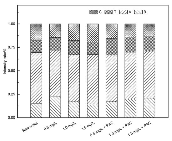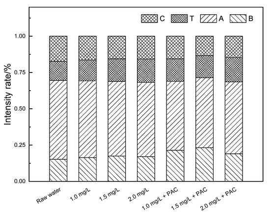 The intensity proportion in regions A and C were 54.3% and 17.3% in raw water, respectively. At a 0.5 mg/L concentration of O3, the intensity proportion in regions A and C were reduced to 49.8% and 15.3%, respectively. This suggested that the combined process had strong removal abilities for fulvic acids and humic acids, contributed by both O3 and PAC.