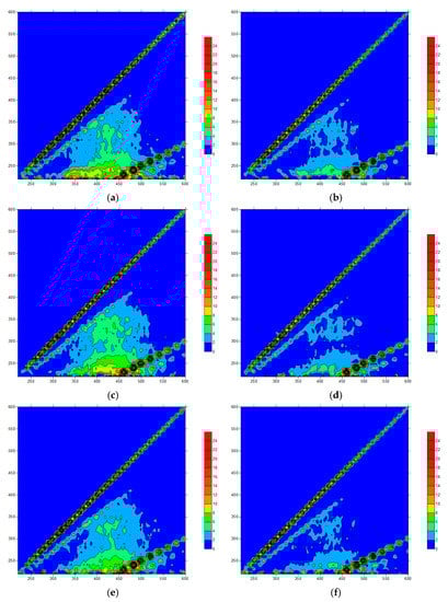 Fluorescence spectra of an O3 pre-oxidation effluent: (a) 0.5 mg/L; (b) 0.5 mg/L + PAC; (c) 1.0 mg/L; (d) 1.0 mg/L + PAC; (e) 1.5 mg/L; (f) 1.5 mg/L + PAC.