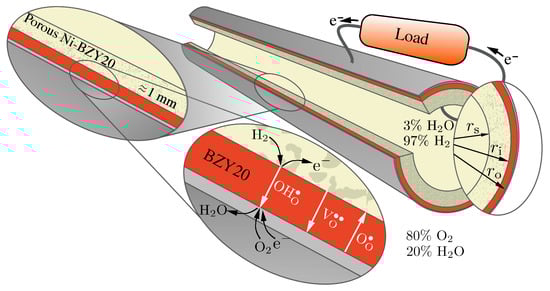 Figure 1 illustrates aspects of the tubular geometry and the transport processes. The profiles and fluxes of three mobile charged defects (protons , oxygen vacancies and polarons ) depend on the current density via an external circuit. Depending on the polarization (i.e., the direction of the electrical current), the cell may operate as a fuel cell or as an electrolyzer []. As illustrated in Figure 1, the present study considers gas-phase mixtures of 20% H2O and 80% O2 on the exterior electrode (positrode) and 97% H2 and 3% H2O on the interior electrode (negatrode).