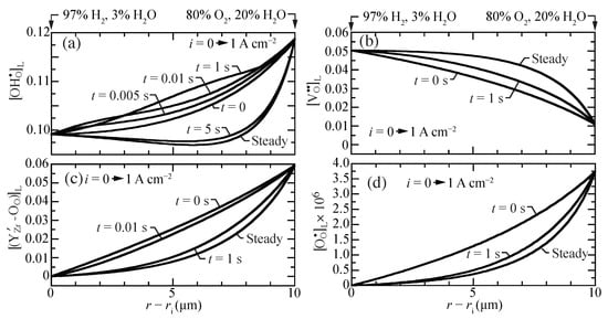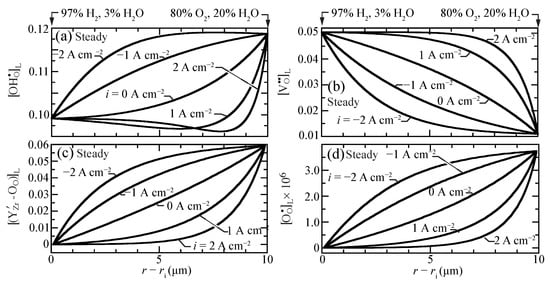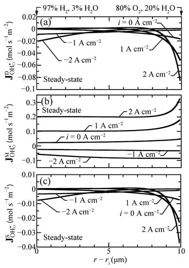 At steady state, the defect-flux profiles must be essentially flat (i.e., very little spatial dependence). However, because of the radial coordinates, there will be very slight radial variations in the steady-state fluxes. The net proton flux comprises diffusion, migration, and stress contributions (Equation (17)). These flux contributions do vary spatially, even at steady state. Figure 5 plots separately the individual steady-state flux-contribution profiles under a range of imposed current densities. These results show that the migration contributions generally dominate. Especially under fuel-cell polarization, the diffusion and stress contributions have strong gradients near the outer boundary. The behaviors are consistent with those reported by Euser et al. [,] for LaSrCoFeO (LSCF) oxygen-transport membranes.