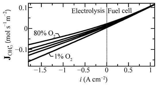 Proton flux is an important measure of membrane performance. Figure 4 shows the predicted proton flux as a function of current density for selected oxygen concentrations at the tube’s exterior electrode. Interestingly, under fuel-cell polarization (), the flux is only weakly affected by the O concentration. The effect is much more significant under electrolysis polarization. As may be anticipated, high steam concentrations (i.e., low O concentration) lead to higher proton fluxes under electrolysis conditions.