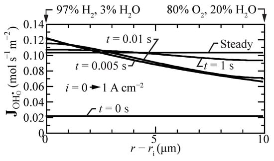 Figure 6 shows proton-flux profiles during a transient between open circuit and a suddenly imposed current density of A cm. Even under open-circuit conditions, there is a small proton flux. Upon polarization, the flux profiles have spatial gradients, with the highest fluxes near the hydrogen fuel boundary. However, within a few seconds, the proton-flux profile becomes spatially uniform again at a significantly higher value, driving protons from the fuel side toward the oxygen side.