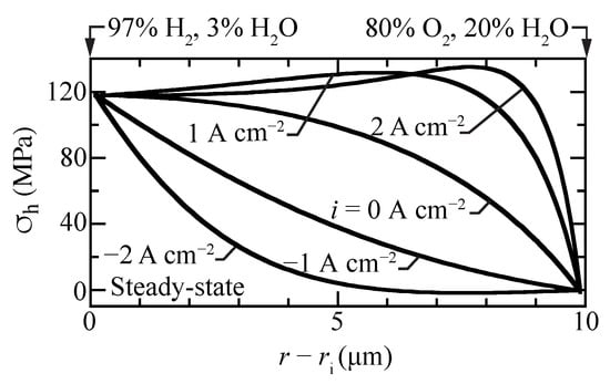 Figure 7 shows hydrostatic stress profiles within the membrane for different imposed current densities. The stresses in the fuel cell mode () are considerably higher than in electrolysis mode (). The fuel-cell stresses have local maxima within the membrane, slightly exceeding the high fuel-side boundary stresses. Moreover, the fuel-cell stress gradients are high, especially near the oxygen boundary. The curvature of the hydrostatic-stress profiles is positive for electrolysis, while it is negative at open circuit and in fuel-cell operation. Under strong electrolysis polarization, there can be a slight local minimum in the steady-state hydrostatic-stress profile. The present model attributes chemical strain to the protons. Comparing Figure 2a and Figure 7 shows that the correlation between the proton concentration profile and the hydrostatic stress profiles is evident.