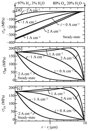 Steady-state stress-contribution profiles for selected current densities A cm) with the cell operating at 600 C. (a) radial, (b) hoop, and (c) axial stress components.