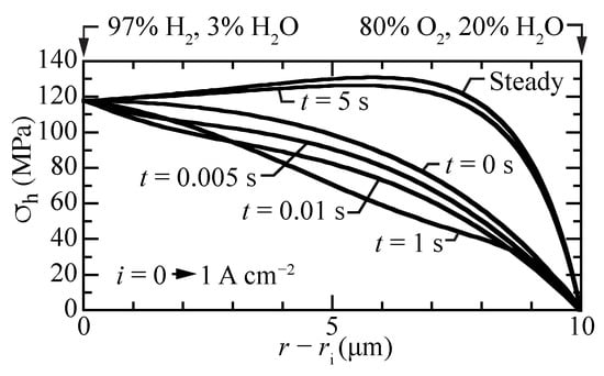Figure 8 shows profiles of the normal stress components that contribute to the hydrostatic stress. The radial stresses are compressive while hoop and axial stresses are tensile and nearly identical. The hydrostatic stress distribution is similar to hoop and axial stresses, although with lower magnitude since radial stresses are compressive (Figure 7). The stresses in the porous support are negligible, as chemical expansion in the support is omitted.