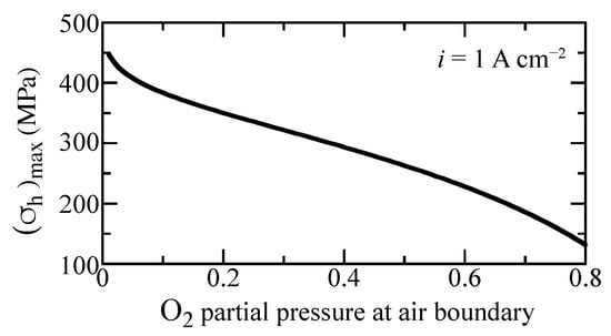 In a practically operating cell, the gas compositions and temperature can vary owing to reagent depletion, dilution, etc. Cell electrochemical performance generally depends on gas-phase concentrations. Local stresses are also affected by gas-phase composition. Figure 10 shows the maximum hydrostatic stress as a function of oxygen concentration for the imposed current density of A cm. As the oxygen partial pressure at the cathode boundary increases, the maximum hydrostatic stress decreases considerably. This curve does not depend significantly on the current density. Consequently, maintaining high oxygen concentration could enhance mechanical integrity.