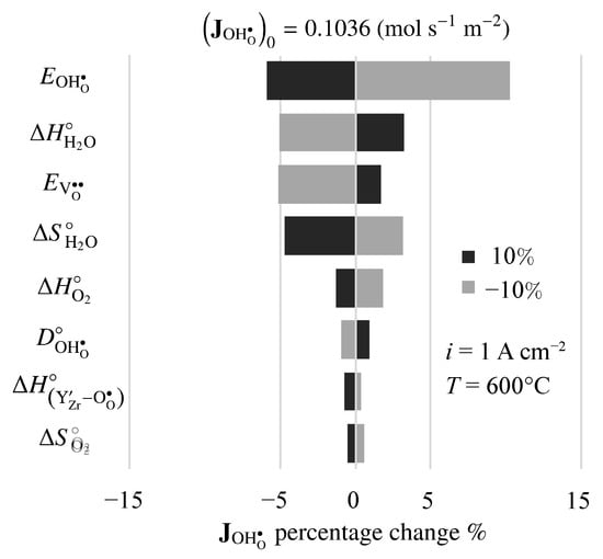 There is considerable uncertainty in some of the physical properties for BZY20. Thus, it is interesting to investigate the sensitivity of predicted results to the model’s properties and parameters. Figure 11 is a tornado plot that shows the effects of varying individual properties by on the predicted proton flux under fuel-cell polarization. The nominal model-predicted proton flux is mol s m. Under these conditions, the highest sensitivities were found to be the activation energy of the proton diffusion coefficient , the enthalpy of the steam-incorporation reaction , the activation energy of the vacancy diffusion coefficient , and the entropy of the steam-incorporation reaction .