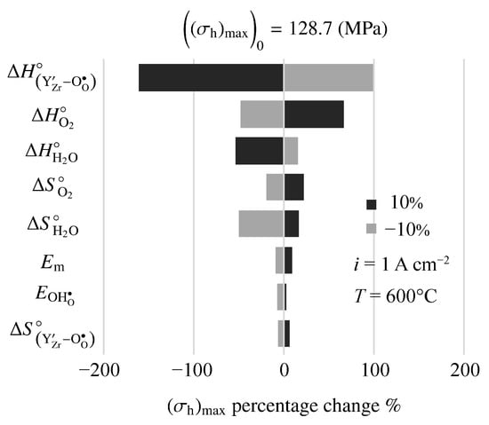Figure 12 is a tornado plot showing sensitivities of model-predicted maximum hydrostatic stress to model parameters. The cell is operating at 600 C with an imposed fuel-cell current density of A cm. Under these conditions, the nominal maximum hydrostatic stress is MPa. The highest sensitivities are to the thermodynamic properties (enthalpy and entropy ) of the defect-incorporation reactions. Interestingly, mechanical properties (e.g., Young’s modulus, ) show relatively small sensitivity.