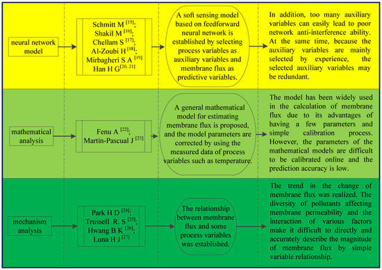 Altunkaynak et al. [] established a soft sensing model of water permeability based on a fuzzy neural network (FNN). In the model, initial flux, inlet shear rate, instantaneous pressure, and filtration time were selected as auxiliary variables based on the mechanism analysis. The model was based on fuzzy mathematics and produces uncertain results.