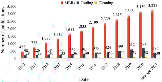 Number of papers published between 2010 and 2021 on MBRs and their fouling and cleaning.