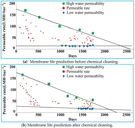 Wang et al. [] drew a prediction chart for membrane life in a reclaimed MBR water plant (Figure 3). As the efficiency of chemical cleaning becomes lower and lower, the distance between the upper and the lower curves gradually shrinks and eventually intersects at a point at which a larger flux cannot be obtained by increasing the operating pressure, nor can the water permeability be further recovered by chemical cleaning. Therefore, this intersection point can be regarded as the end of the membrane life in a practical sense. The membrane life was first defined via different concepts, and it was predicted from various perspectives such as water yield, water quality, decay of water permeability, cumulative chlorine contact value, and membrane performance. The results showed that permeability decay and membrane performance are feasible parameters to judge membrane life, while the remaining three parameters are not ideal.