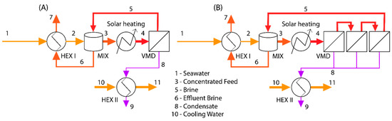 The solar thermal desalination scheme used for exergy analysis. Here, HEX I and HEX II refer to the heat exchanger on the feed and permeate stream, respectively. The MIX refers to a mixing tank used for thermal and concentration management of the solar-VMD loop. (A) A single-stage process. (B) A multi-stage process with 3 stages.