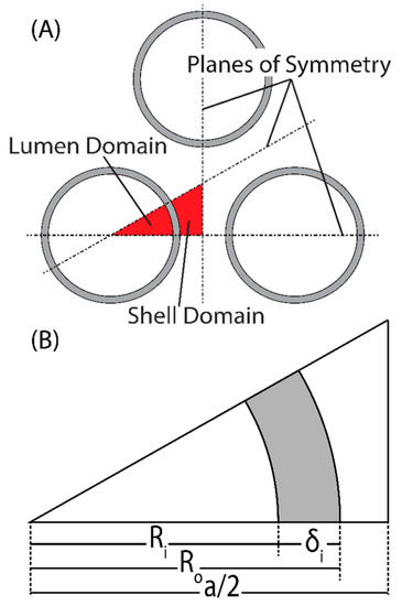 (A) Packing configuration showing the planes of symmetry generated (dashed lines), and the resulting lumen and shell domains used for computation. (B) Definition of variables for the computational domain in this work. Here, the gray-shaded areas represent porous membrane.