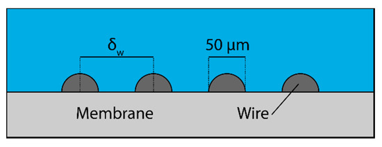 There is a twofold problem with this scheme. First, the addition of the wire around the membrane covers a portion of the membrane and reduces the surface area of the membrane available for distillation. This is exemplified by the 1 mm spaced baffling in Figure 7. At the highest temperatures, the shortened baffling leads to the most significant increase in permeate flux. At lower temperatures, the improvement is less pronounced. Decreasing the spacing at these temperatures covers more membrane area and reduces the actual surface area for mass transport. Secondly, the sharp, local, increase in salt concentration on the upstream side of the wire will result in an increase in scaling at that point. The first problem can be readily optimized to achieve better results. The second problem can be handled by the addition of hydrophobic or omniphobic coatings to the surface of the membrane and whatever baffling is added to it [7]. Reducing the distance between baffles to reduce salt concentration will also help to inhibit scaling by reducing the concentration of salt along the boundary.