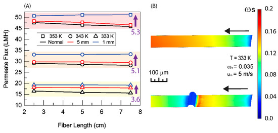 Figure 4A shows the effect of membrane porosity on the average permeate flux of a 5 cm membrane. Porosity is defined by the void fraction of a membrane (or the volume of a membrane that is not occupied by the membrane material). Equations (11)–(13) predict a linear relationship between porosity and permeate flux. This predicted relationship is largely maintained in the average flux. Permeate flux increases approximately linearly with porosity. The slope of this linear relationship is determined by feed temperature. Lower feed temperatures show a smaller slope than higher feed temperatures. This is because ΔP and Pm in Equations (10) and (13) are larger. The same change in porosity leads to a larger change in the overall slope determined by Equations (10)–(13). A slight concavity is present in the data sets due to polarization. Higher values of permeate flux at the inlet lead to more significant polarization and a degradation in average flux, though the initial behavior predicted by Equations (10)–(13) can be maintained.