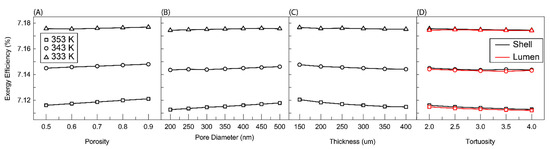 Exergy efficiency as a function of (A) porosity, (B) nominal pore size, (C) membrane thicknesses, and (D) effective tortuosities. In (A–C) the feed was charged to shell side, (D) Shows for both cases, charging feed into the shell and lumen. Here, the R/a ratio is fixed at 0.35, the membrane length is 5 cm, feed velocity 5 m/s, and the channel in the permeate pressure is maintained at 5 kPa.