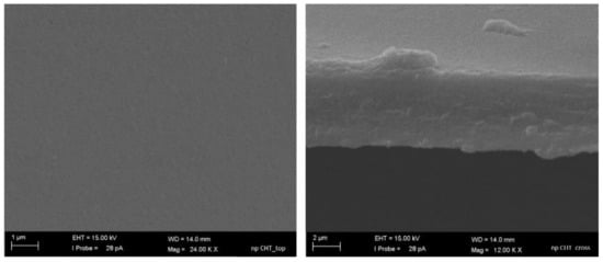 As evidenced by SEM images, the nanoporous CHT membrane revealed a homogeneous and smooth surface (Figure 1a) and a cross section with a thickness of 5.5 ± 0.9 µm (Figure 1b). The capillary flow porometer analysis demonstrated the presence of open nanopores with mean flow diameter of 26 nm.