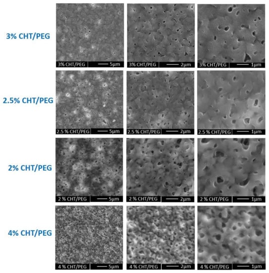 Microporous membranes were prepared by dissolving CHT and PEG Mw 10,000 Da as porogen in a different (wt/v) % and ratio in the casting solution, as reported in Table 1. After the evaporation-induced phase separation process, the porogen was dissolved in a water bath at 80 °C. This treatment allowed the selective removal of PEG while keeping the polymer structure unaltered, since chitosan is stable at this temperature as known from thermogravimetric curve of the polymer (with 94% degree of deacetylation) [18,19]. After extensive washing and the drying process, microstructured membranes with a thickness of 22.6 ± 0.1 µm were obtained.