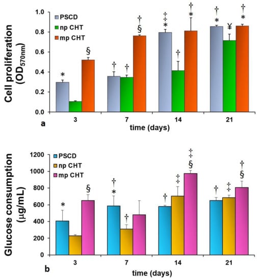 Figure 5. Cell proliferation (a) and glucose consumption (b) of human keratinocytes at different days of culture on nanoporous chitosan (np CHT) and microporous chitosan (mp CHT) membranes, and on polystyrene culture dishes (PSCD) as reference substratum. The values are the mean ± standard deviations of three experiments per configurations. Data are statistically significant according to ANOVA followed by Bonferroni’s t-test (p < 0.05): (*) vs. np CHT, (§) vs. np CHT and PSCD, at the same day of culture; (†) vs. day 3, (‡) vs. days 3 and 7, (¥) vs. days 3, 7 and 14 of culture, on the same substratum.