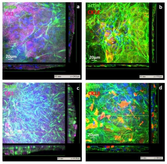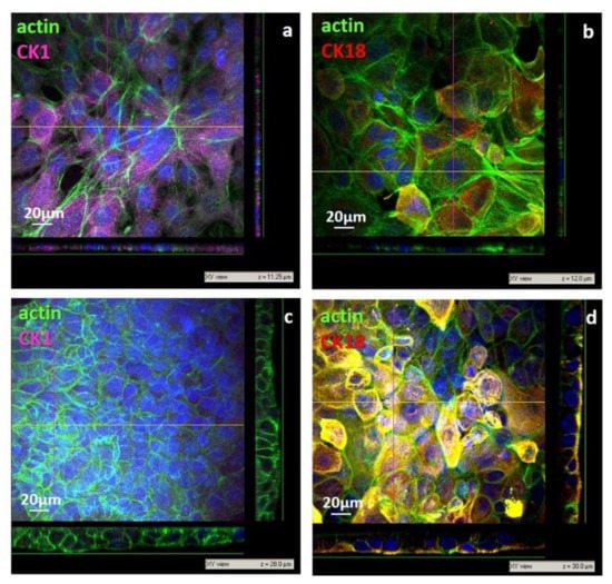 After 3 days of culture, small and densely packed cells were found in adhesion to the microporous surface of the mp CHT membrane, with a spreading degree of 330 ± 107 µm2 and an elongated columnar shape, as shown in the xz and yz projection of confocal images (Figure 6c,d), like the cells of the basal lamina of epidermis. Cells with more cuboidal shape and an enlarged surface of 765 ± 230 µm2 were found in the upper level. The multistrata growth and disposition, with flattening of cells moving from the bottom to the top levels, was observed in confocal acquisition along the z axis, as illustrated in the xz and yz projection of CLSM image, reaching thickness of 28–30 µm (Figure 6c,d), which is peculiar of viable epidermis [1]. It should be noted that unlike the human keratinocytes cultured on the nanoporous membrane, cells on the mp CHT membrane after 3 days of culture exhibited a remarkable expression of CK18 (Figure 6d) as a result of their sustained growth activity, also corroborated by the cell proliferation and glucose consumption (Figure 5). Moreover, the quite missing CK1 expression (Figure 6c) evidenced that cells did not reach their terminal differentiation belonging to keratinocytes of the suprabasal corneum layer.