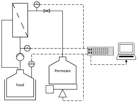 The technical data for the ceramic membranes used in this study are summarized in Table 1. All membranes were manufactured and kindly provided by MANN+HUMMEL (Ludwigsburg, Germany), except for the monochannel 200 nm MF membrane, which was purchased from Atech Innovations (Gladbeck, Germany). The feed solution (1.5 L) was circulated using an FCPA 80B-4/HE rotary vane pump (AFT, Rosstal, Germany). The temperature of the feed vessel was measured using a PT-100 sensor and was maintained at 25 ± 1 °C by immersion in a water bath. The transmembrane pressure (TMP) was adjusted using a manual ball valve located behind the membrane module and was measured using two type-401001 sensors (JUMO Mess- und Regeltechnik, Vienna, Austria) in front and behind the membrane module. The feed volume flow was measured using an SM6000 magnetic-inductive flow sensor (ifm electronic, Essen, Germany). The permeate flow was measured gravimetrically using a DS 8K.05 balance (Kern & Sohn, Balingen, Germany). Filtrations were carried out in total recycle mode (TRM), and the permeate was regularly recycled to the feed. Data were recorded using a LABmanager 1 and the corresponding software LabVision v2.9 (both from HiTec Zang, Herzogenrath, Germany). The filtration setup is shown in Figure 1.