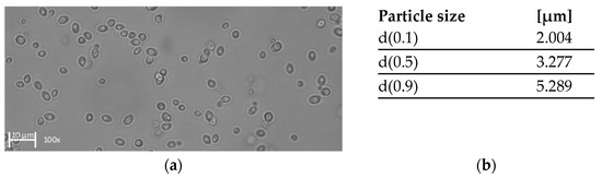 Characterization of K. lactis cells after harvest. (a) Image of K. lactis in 150 mM citrate-phosphate buffer (pH 5) captured by light microscopy at 100× magnification. (b) Calculated d-values based on the volume related particle size measurement.