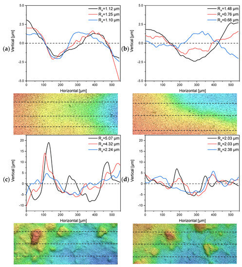 One-dimensional profiles for the determination of surface roughness and topographical images (200 µm × 550 µm) from multiple line measurements of the tubular UF membranes 7C_s and 7C_r. Dashed lines indicate the profile location. (a,b) Profiles and topographical images from two randomly-selected segments of membrane 7C_s. (c,d) Profiles and topographical images from two randomly-selected segments of membrane 7C_r.