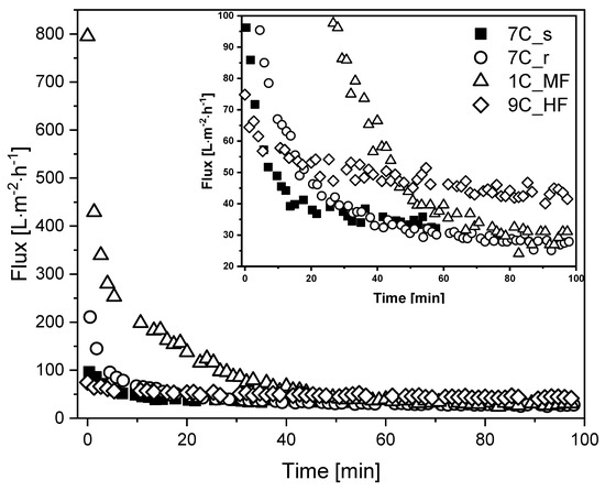 Flux curves during the filtration of fermentation broth with different membranes (TMP = 0.5 bar, temperature = 25 °C). The CFV was 0.8 m s−1 for all membranes except 9C_HF (CFV = 1.6 m s−1). An enlargement of the graph covering the low-flux region is shown in the upper right corner for clarity.