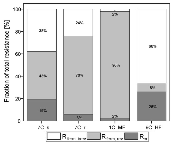 Partition of resistances caused by the filtration of fermentation broth. The sum of the reversible and irreversible resistance is Rferm. The sum of Rm and Rferm is Rferm, tot. The 100% values correspond to a total resistance Rferm, tot of 5.04 × 1012 m−1 for 7C_s, 5.52 × 1012 m−1 for 7C_r, 5.38 × 1012 m−1 for 1C_M, and 3.81 × 1012 m−1 for 9C_HF.