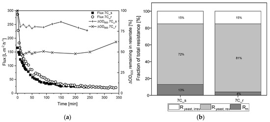 To investigate the influence of surface roughness and the number and thickness of separating layers in more detail, the fermentation broth was fractionated into the two main components medium and yeast cells. Figure 7a shows the TRM flux curves using K. lactis cells as a feed at a CFV of 0.8 m s−1 and the biomass remaining in the retentate based on the ΔOD600. The corresponding percentage resistances are shown in Figure 7b. The absolute values of resistances caused by the filtration of K. lactis cells are provided in Supplementary Material S1.3.