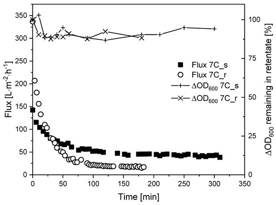 Flux curves and biomass remaining in the retentate during the filtration of K. lactis cells (TMP = 0.5 bar, CFV = 1.1 m s−1, temperature = 25 °C) using membranes 7C_s and 7C_r.